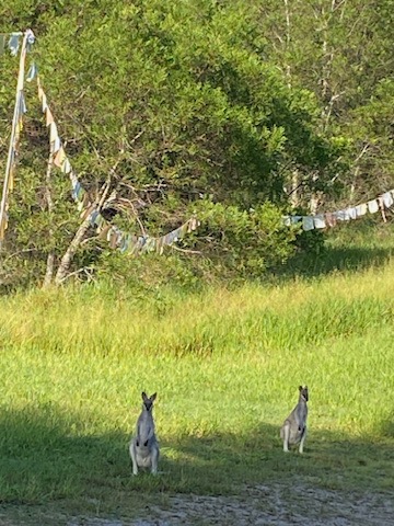 Current retreatant Mark is mowing up a storm, and Harry and Sarita have popped in doing maintenance on water, electricity and jumping on the ride-on mower too! The wallabies especially love eating the short grass after a good mowing session. Marek (from Dzamling Gar) is taking care of the pool cleaning and brainstorming with Harry over how to get our bore water well activated. Belen has been working in the garden. Ella who runs our Airbnb (formerly Rinpoche and Rosa’s apartment at one end of the farmhouse) is a regular too.