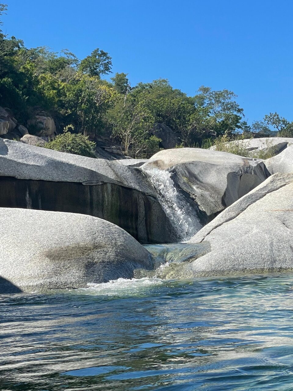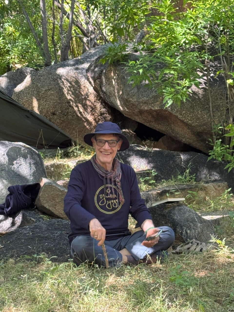 In the later afternoons many of the group walked down to another part of the river, about twenty minutes away. This very special place is marked by an enormous stone on which one can find the red handprints of small hands high up on the rock. The rock formations are beautiful – large, rounded, and smooth and mostly white flecked with dark spots. The river flows rapidly and forming waterfalls here and there, and pools beneath them. The area is large and afforded a spaciousness for the practice, and a bounty of all the elements with which to integrate.