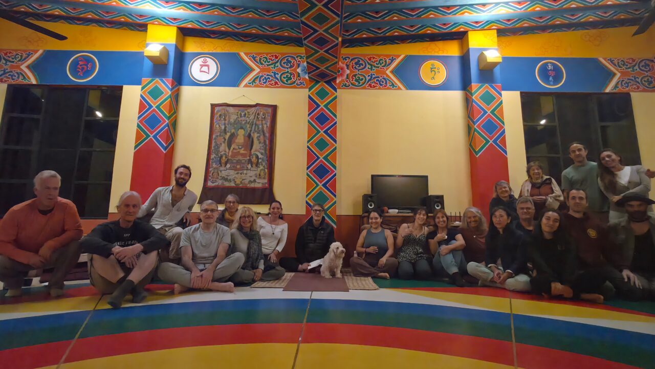 Our first practice session took place a short walk from the wonderfully colorful Gönpa, where we arranged ourselves on the stones around the river for a session of Rushen of the Voice. Back inside the Gönpa we were treated to a video of Fabio up on a stage. Recorded in 2012 at Dzamling Gar, it showed him explaining the body positions of the Longde practice. The current-day Fabio ridiculed his former self, mimicking the toss of his erstwhile long braid over to the other shoulder. From Fabio also came stories of an even earlier time in his life when he and three others shared a hut in the country and practiced Longde all day for many weeks. “It was like being in love” he said.