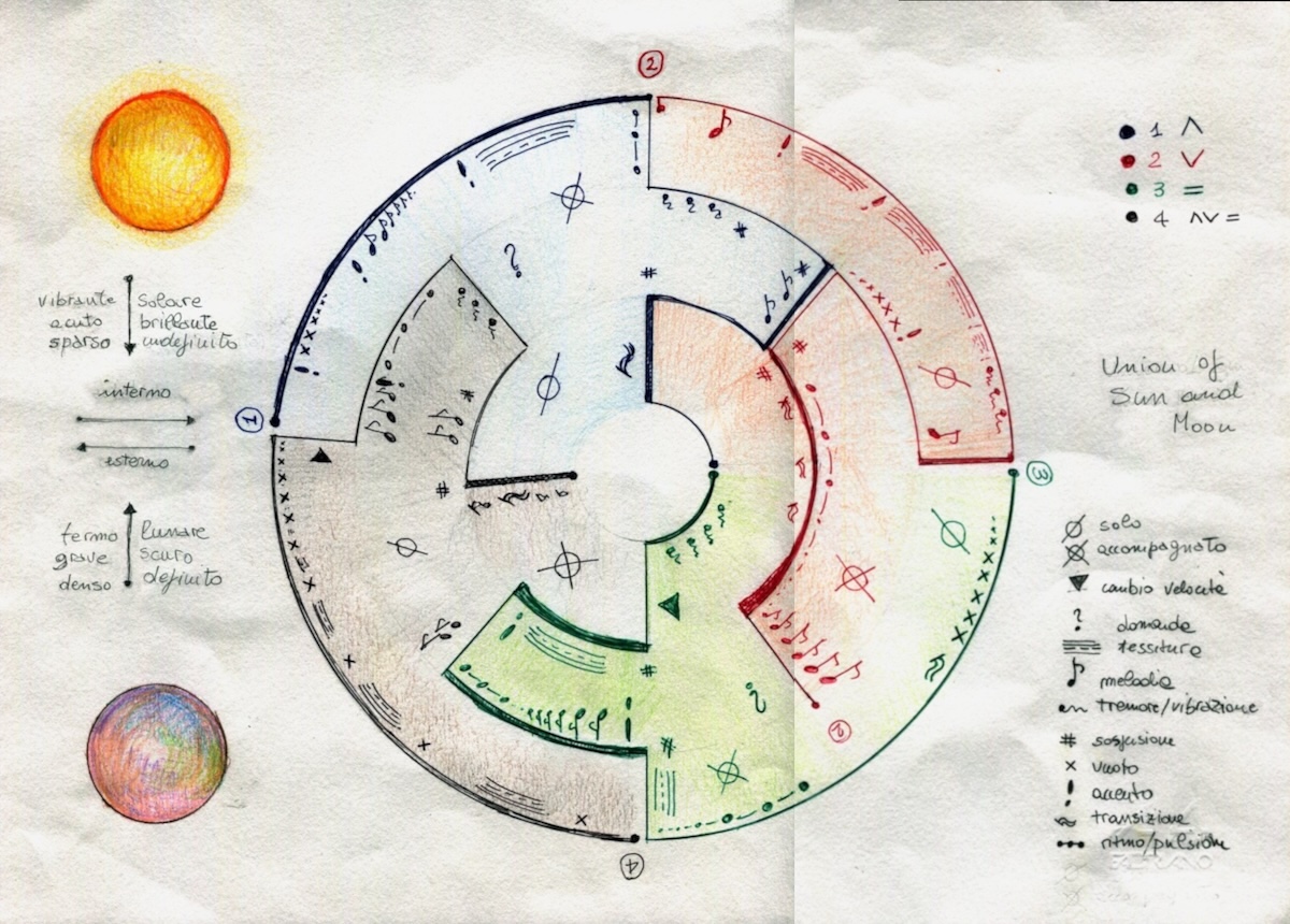 When I composed this piece a few years ago, I had not yet determined a concrete method for performing it. In this sense, the process resembles modal jazz improvisation: one commits an entire life experience to a limited set of sounds, trusting that something meaningful will emerge, even if its final form is unknown. The structure we followed is inspired by the image attached (see above image), which is the actual score. It is intended for four musicians of any background or instrument, who alternate roles in a circular manner, similar to a mandala.