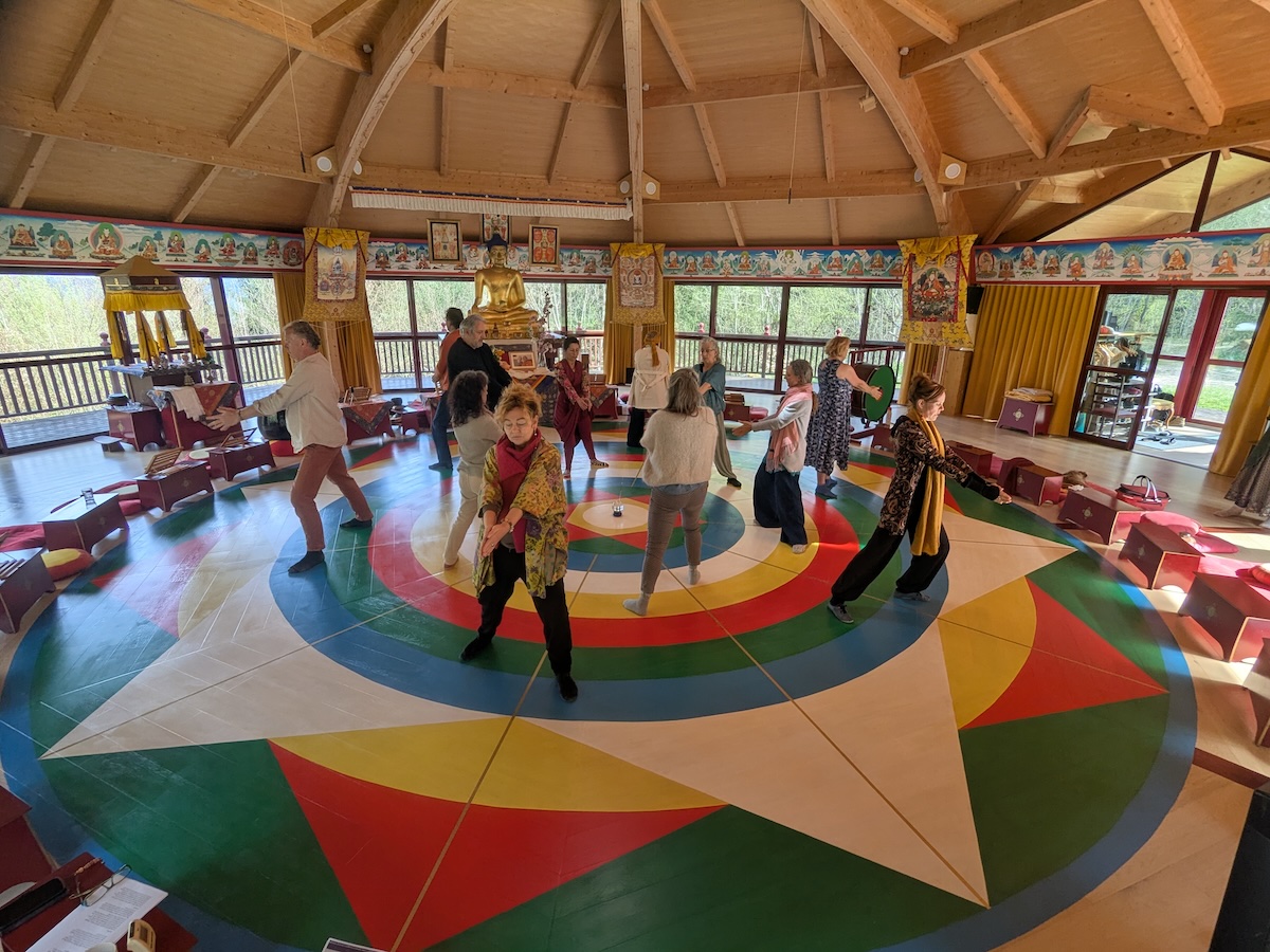 A mandala has been painted in one of the temples of the main building, a Carthusian monastery which unfortunately burned down in 2017. Since that winter, we, the dancers, have been very lucky – a wonderful new mandala has been painted on the new floor of the House of Wisdom, a temple built on the model of the Gönpa of Merigar.