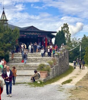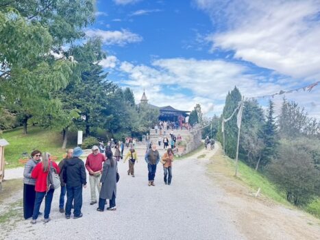 Il programma completo includeva l’insegnamento “I luoghi dell’anima” tenuto da Namkhai Yeshi sabato 27 settembre 2025. Durante l’insegnamento mattutino, il Gönpa di Merigar sembrava essere teatro di un ritorno a casa, poiché era pieno di circa 300 praticanti che si abbracciavano e si salutavano, alcuni dopo diversi anni di assenza. È stato bello avere la possibilità di salutare Rosa Namkhai, che era presente, insieme al Gakyil di Merigar West e agli istruttori autorizzati. Oltre agli studenti che hanno partecipato di persona, provenienti principalmente dall’Italia, ma anche dalla Svizzera, dalla Francia, dalla Germania, dalla Spagna, dal Regno Unito, dagli Stati Uniti, dall’Uruguay e da altri paesi, c’erano anche 1.450 connessioni su Zoom e almeno 3.516 spettatori unici che hanno seguito l’insegnamento tramite webcast (dati riportati nella prima mattinata di domenica, mentre i dati di partecipazione al webcast erano ancora in fase di raccolta).