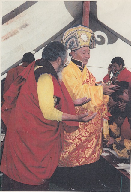 La seconda occasione fu il rito per consacrare gli stupa nel villaggio del suo maestro Changchub Dorje, durante il quale indossava un mantello di tonalità rossa con fasce azzurre sul quale erano stampati i saggi del lignaggio. In tutte queste occasioni la cerimonia assumeva forme esteriormente molto diverse da quelle che avevo praticato a Merigar e nei Gar occidentali. Difficile descrivere l’intensità delle emozioni scatenate credo anche nel Maestro dalla magia di quei momenti, tra sguardi attenti di volti dai tratti etnici immutati da tempo immemorabile, la musica dei lunghi corni e il cupo rimbombo dei grandi tamburi, la nuvola odorosa piacevole all’olfatto usata per la purificazione anche tra gli indiani d’America, come mi disse Rimpoche che aveva assistito tra i Navaho a riti simili al sang tibetano: “Molti mi scambiavano per uno di loro e chiedevano da quale tribù venissi”.