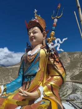 Siamo profondamente felici di annunciare che la nostra statua di Guru Padmasambhava, alta nove metri, creata in onore del nostro amato Maestro Chögyal Namkhai Norbu, è stata completata. La statua si erge nel paesaggio mozzafiato dell’Upper Mustang, in Nepal, sulle montagne, vicino al confine tibetano, in una zona ricca di tradizione Vajrayana. Lì, innumerevoli praticanti di Guru Rinpoche si riuniranno, pregheranno e troveranno ispirazione nella loro fede.