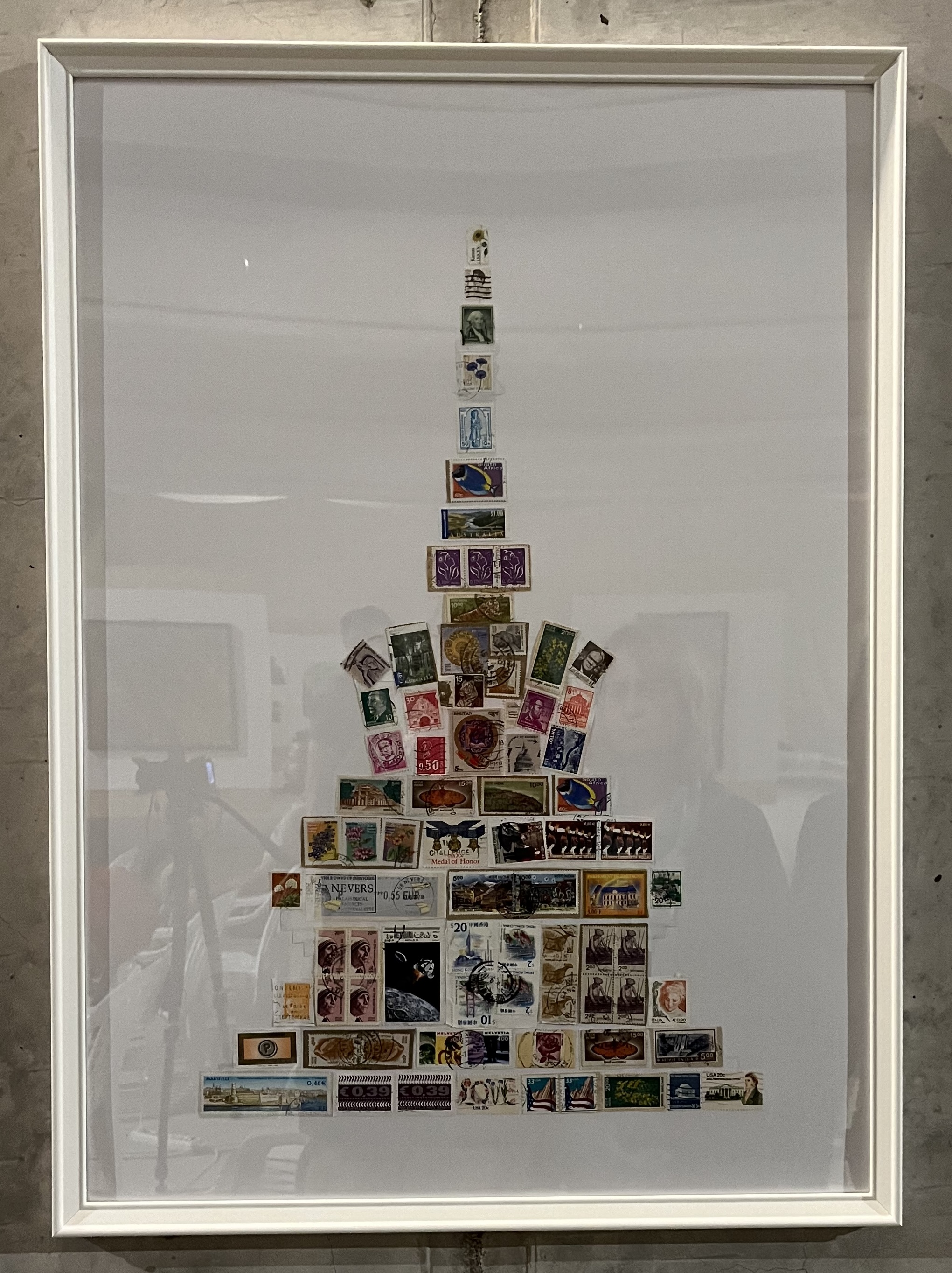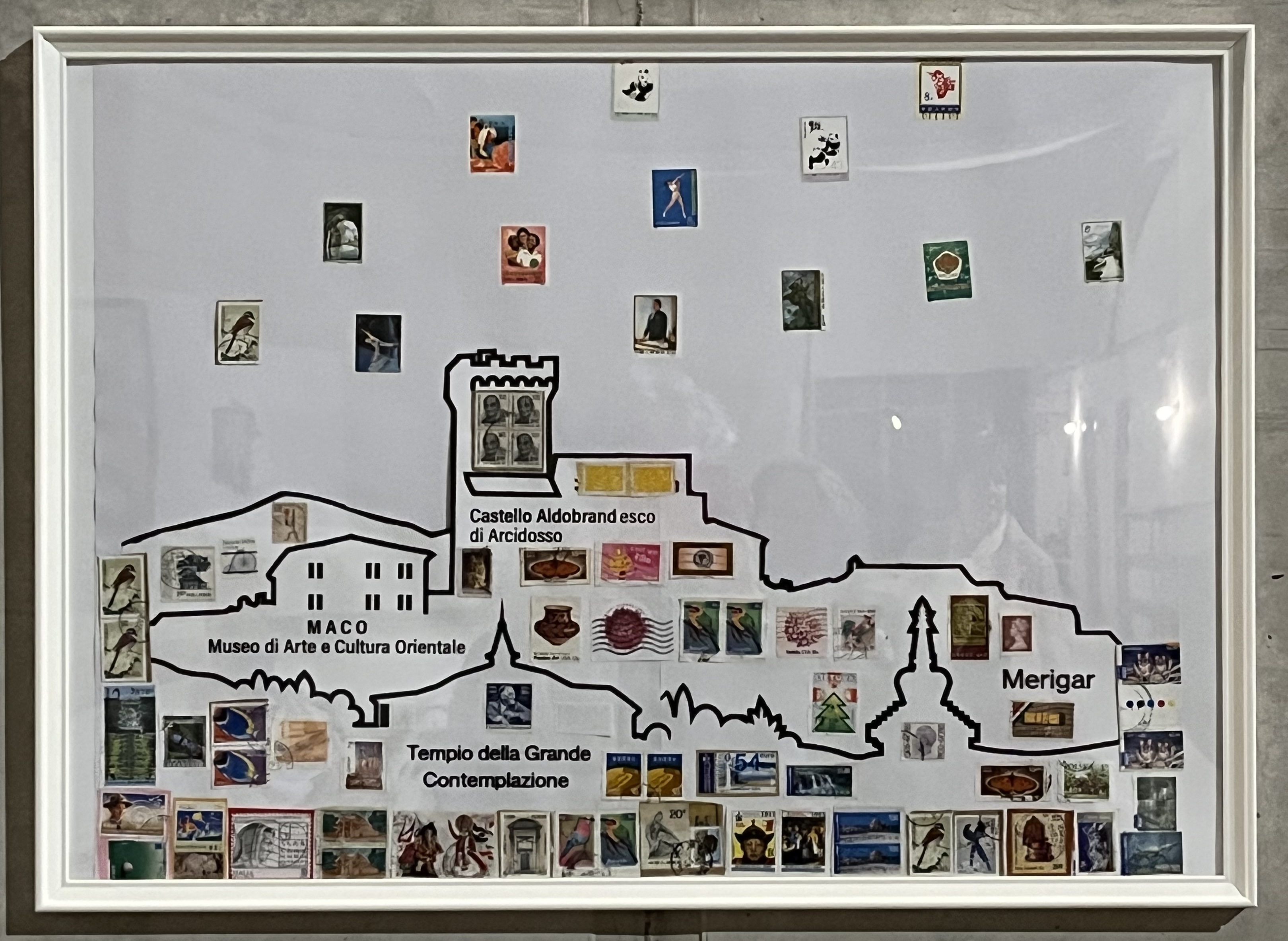As always the activity of Rosa Namkhai has always been based in her dedication to the Dzogchen Community and to help explain Rinpoche’s dimension. All the stamps that are used in this artwork, the collection of the stamps, was started by Rinpoche. As I remember in the beginning Rinpoche started collecting stamps for a relative who liked to collect stamps. The stamps are from all over the world. If you look you can see all of these stamps are related to a certain epoch. It started with the form of the jewels and then the bigger jewels of the stupas. And then you find one that represents the museum of Merigar and Arcidosso all in one depiction.