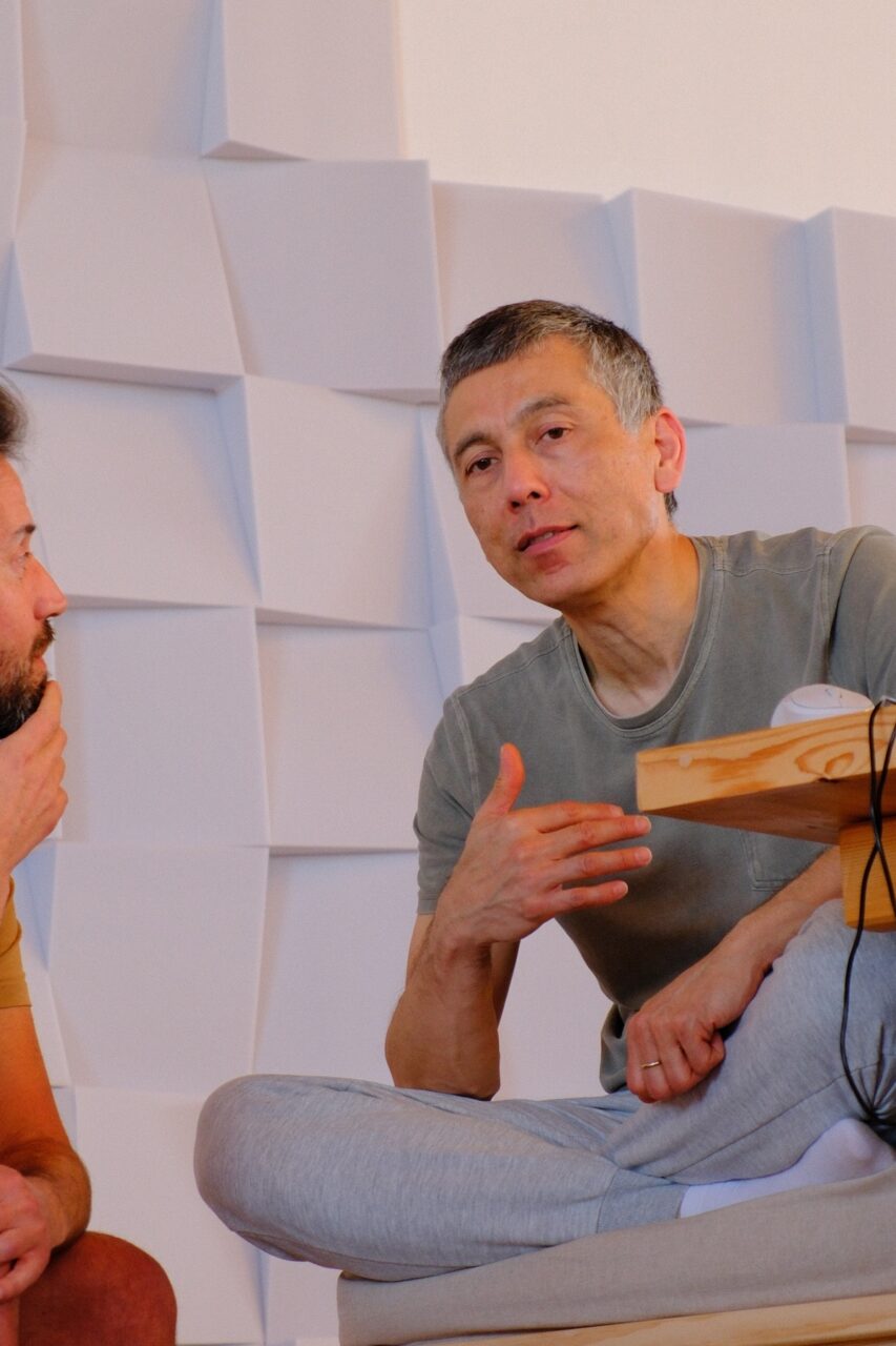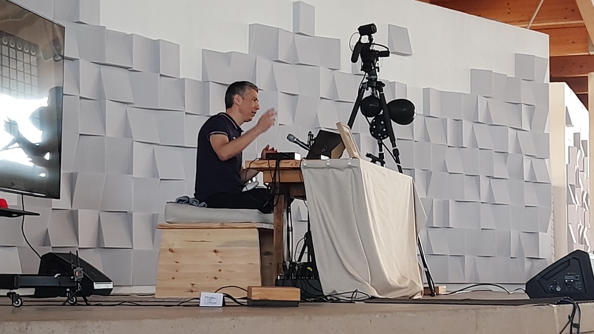 The view in the Gönpa was devoid of extraneous frills; it indicated a clarity of purpose. The space had been painstakingly prepared with sound absorbent walls and baffles to create an optimal environment for the ambient quadraphonic sound demonstrations. In front Namkhai Yeshi sitting simply with a picture of the Master Chögyal Namkhai Norbu and a glorious white ‘A’ above.