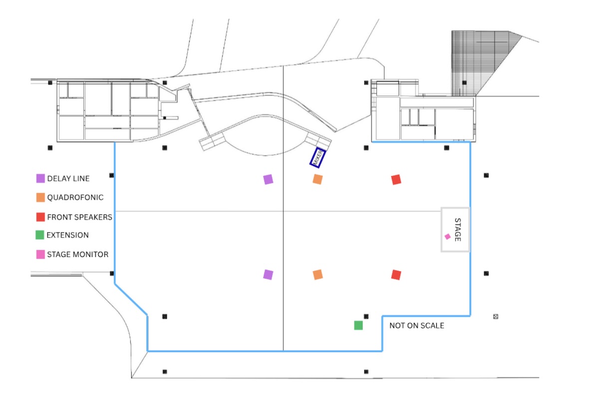 Под чутким руководством Филипа мы создали квадрофоническое звуковое пространство, в котором можно будет погрузиться в звукововые ландшафты, созаднные Еши. Мы также настроили систему таким образом, чтобы голос был чётко слышен по всей гомпе ещё до завершения работ по акустической обработке.