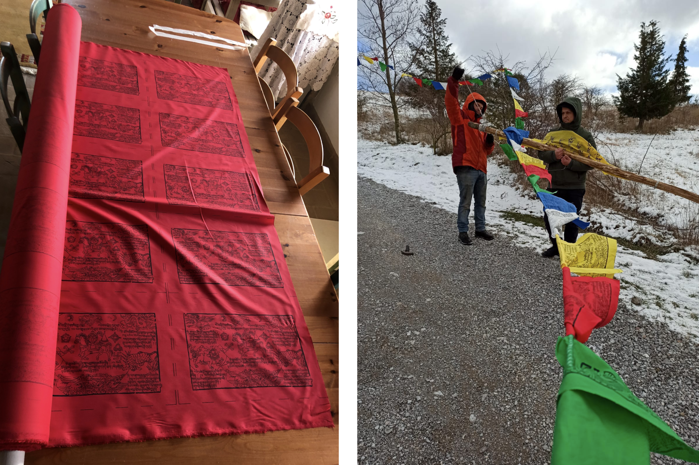Once ready, at Merigar the new prayer flags are traditionally authenticated during the Ganapuja on Losar, the first day after the change of the animal and of the elements relating to the year. Then they are hung in the morning starting from the third day of the first lunar month, after the Sang, until the full moon. They then continue to be authenticated for the rest of the year, always on the waxing moon, and hung at the same time, usually in the morning.